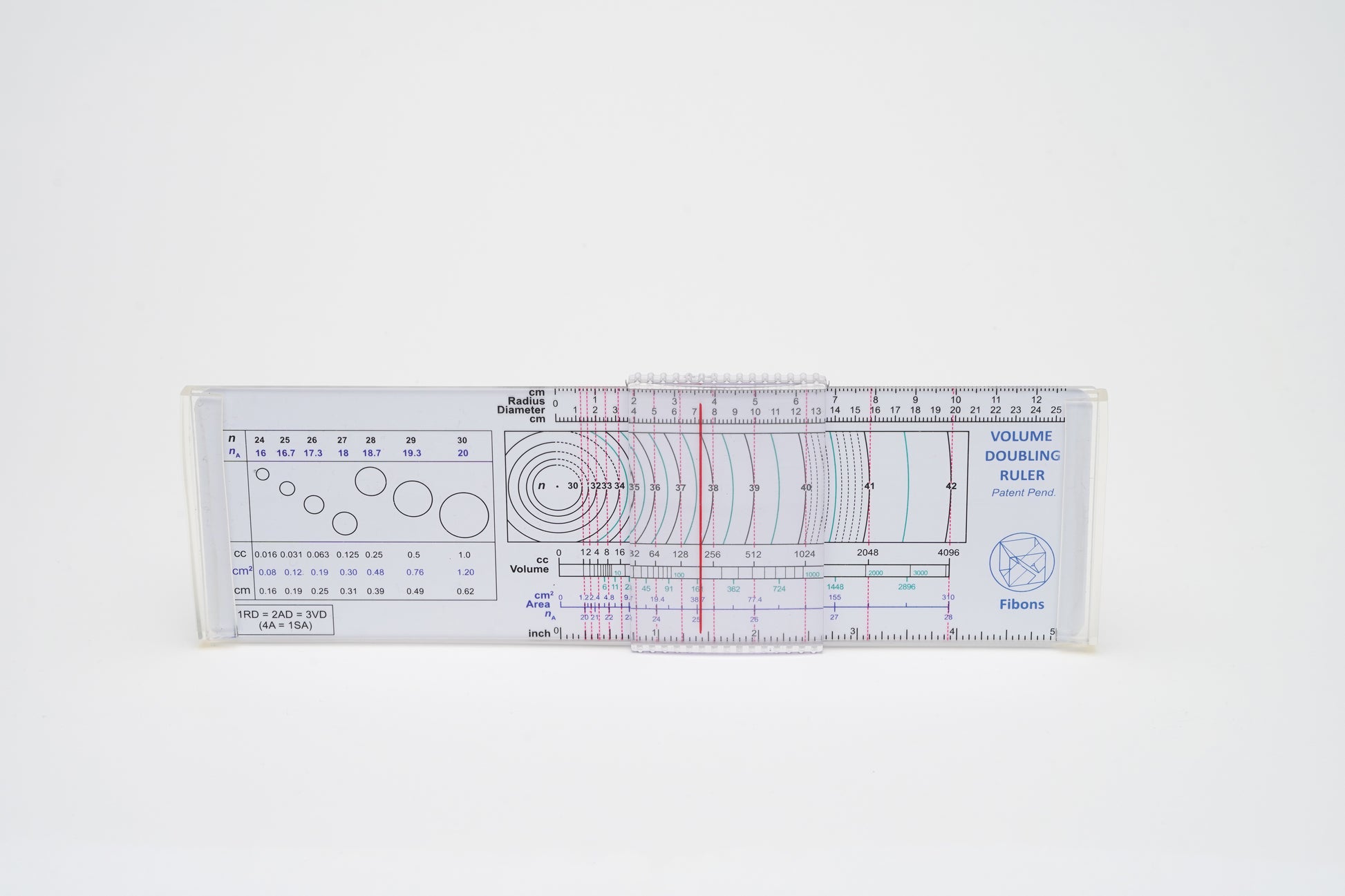 The Volume Doubling Ruler measures objects defined by a circle or sphere for comparison over time and between similarly shaped objects, in Doubling Number Units, n30 = 1 cc, from 0.016 cc (n24) to 4096 cc (n42) (over 4 liters), or an 18-fold change in Volume Doubling number.