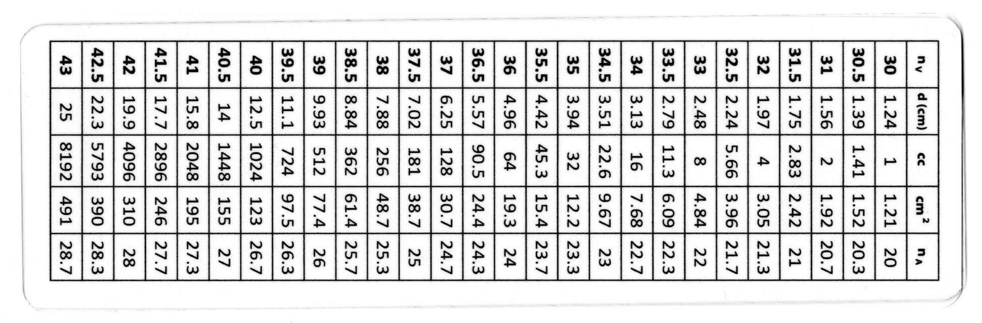 The Volume Doubling Ruler measures objects defined by a circle or sphere for comparison over time and between similarly shaped objects, in Doubling Number Units, n30 = 1 cc, from 0.016 cc (n24) to 4096 cc (n42) (over 4 liters), or an 18-fold change in Volume Doubling number, over a 250,000-fold change in volume. Small volumes (<n30) read by edge of cursor, over n30 from red drop line as in a slide rule.